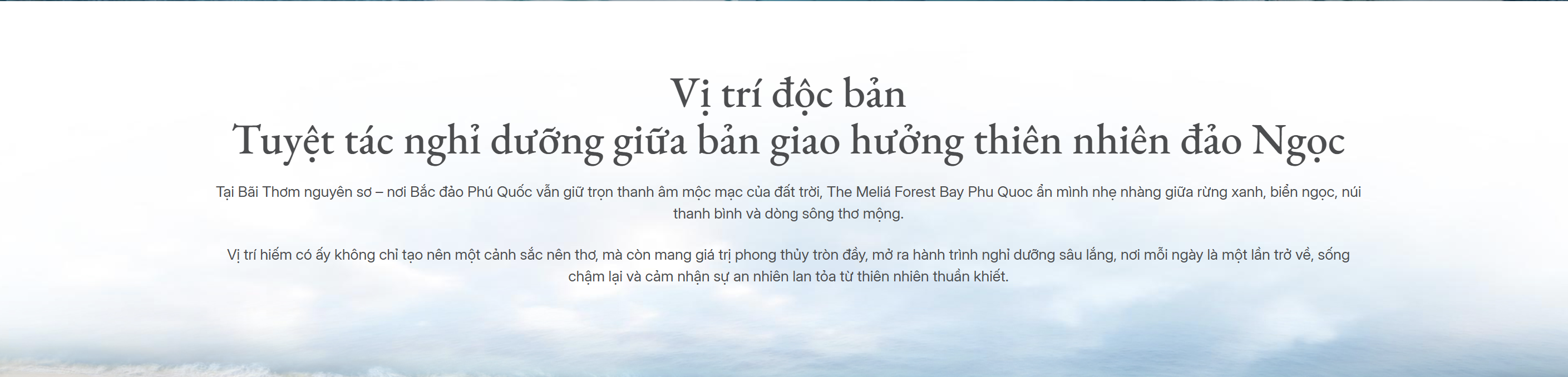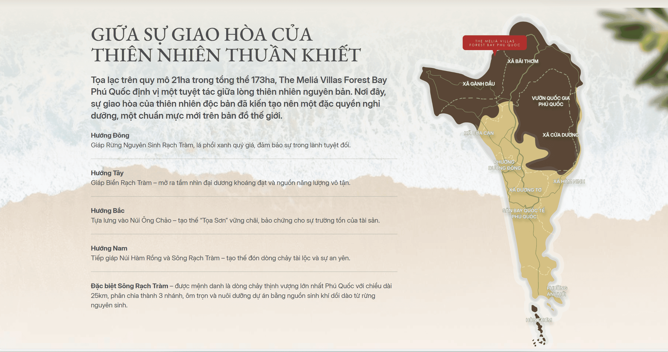 Tọa lạc trên quy mô 21ha trong tổng thể quy hoạch 173ha, The Meliá Villas Forest Bay Phu Quoc hiện diện như một tuyệt tác giữa lòng thiên nhiên nguyên bản nơi giao hòa của bốn tầng sinh thái quý hiếm, tạo nên vị thế độc bản hiếm có trên bản đồ nghỉ dưỡng Phú Quốc.