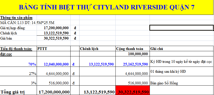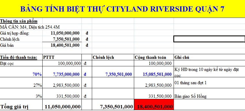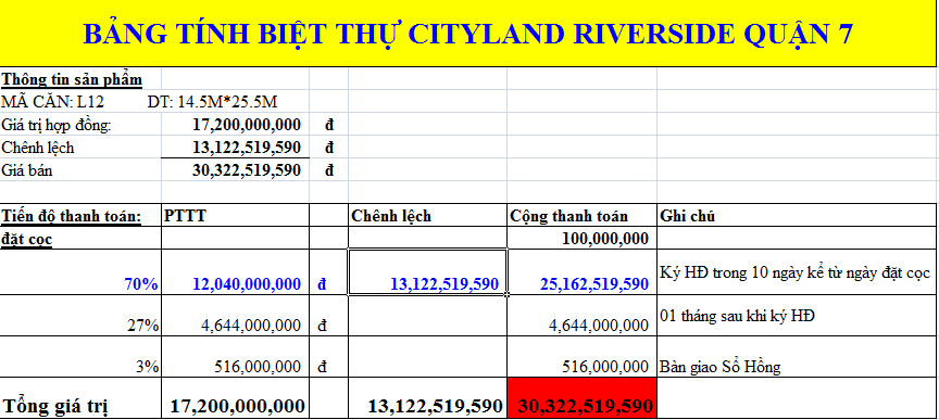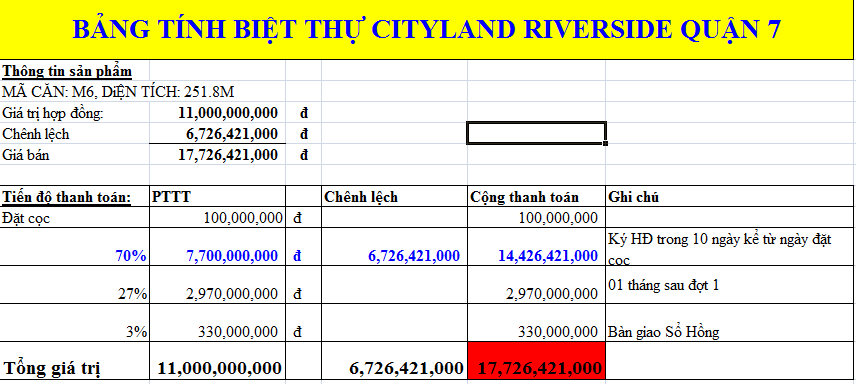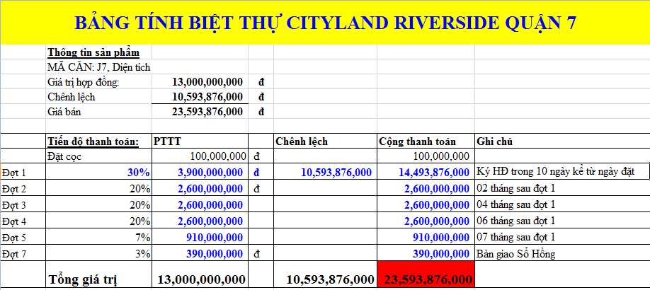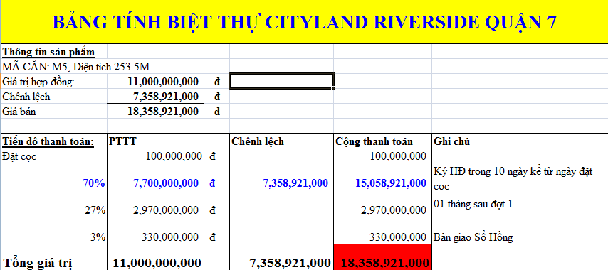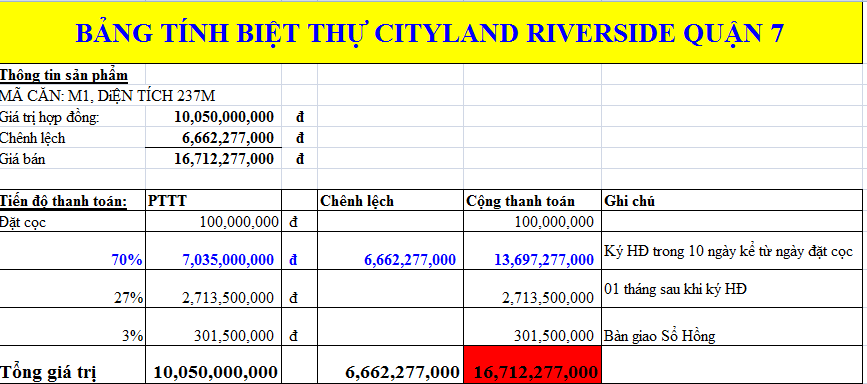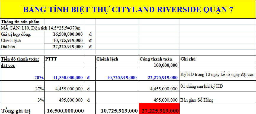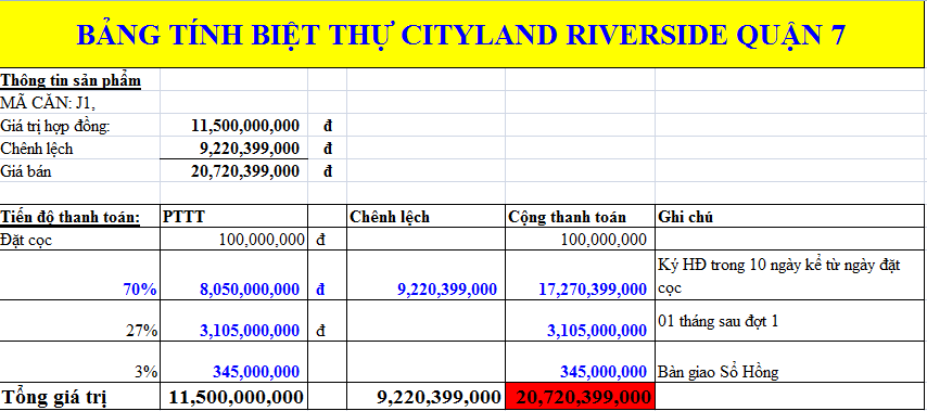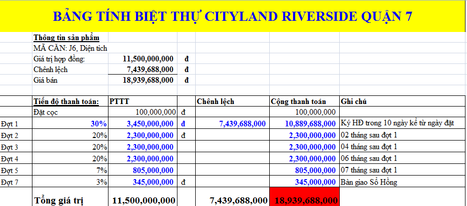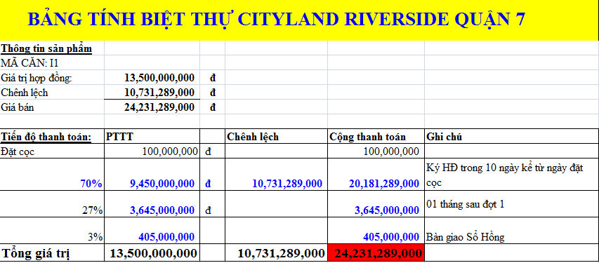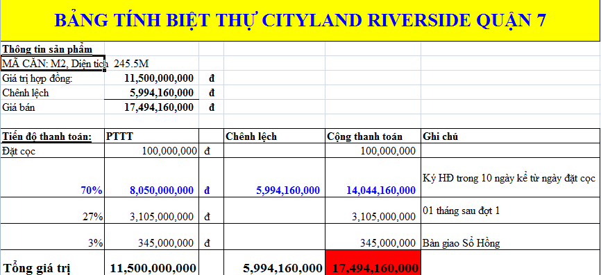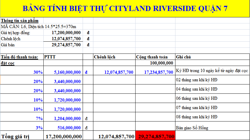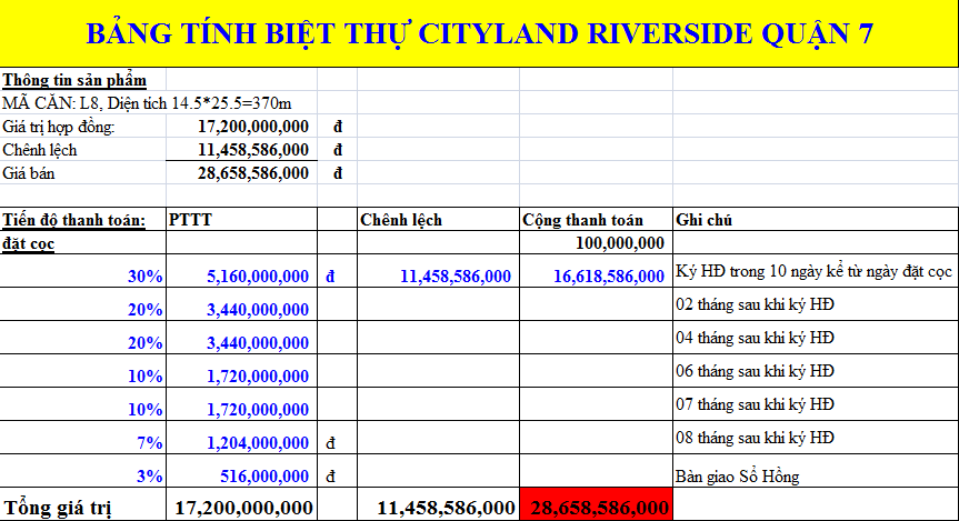 BẢNG GIÁ VÀ TIẾN ĐỘ THANH TOÁN CITYLAND RIVERSIDE QUẬN 7