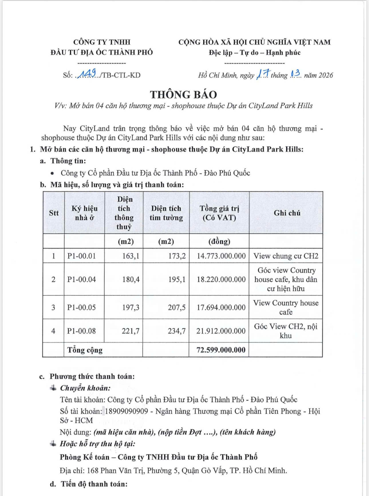 Phòng Kinh doanh CĐT Cityland cập nhật thông tin giỏ hàng 4 căn shophouse căn hộ Cityland Park Hills Gò Vấp với thông tin giá bán và phương thức thanh toán như sau:
