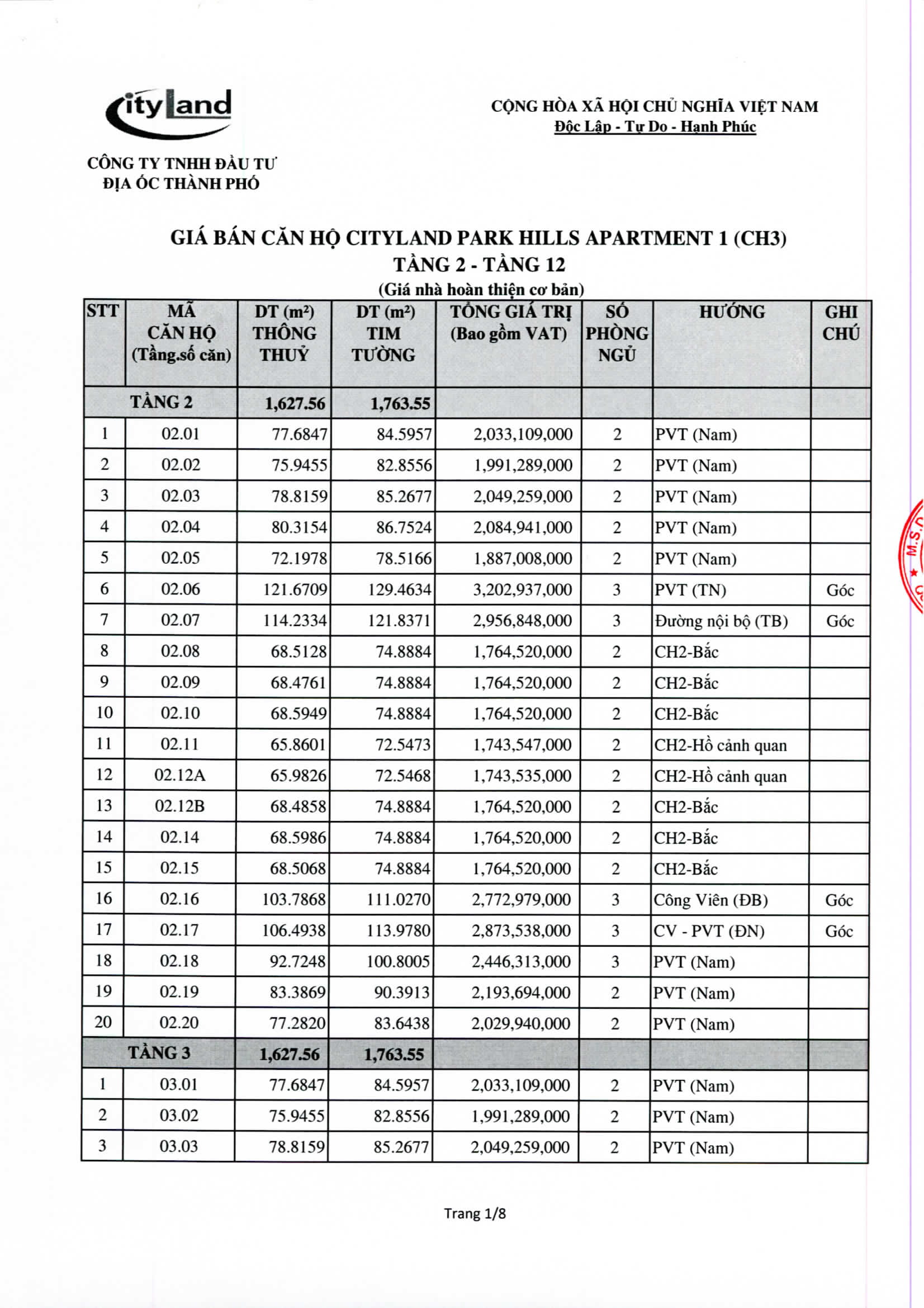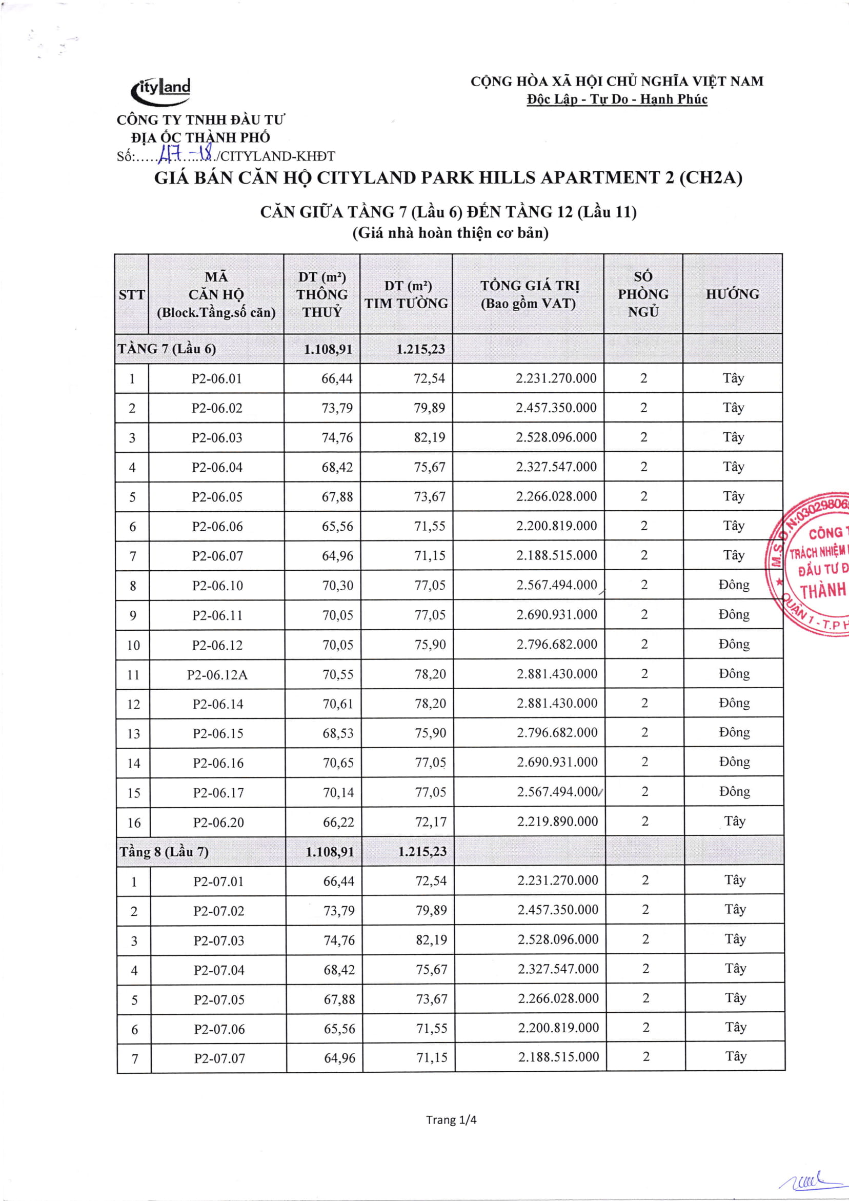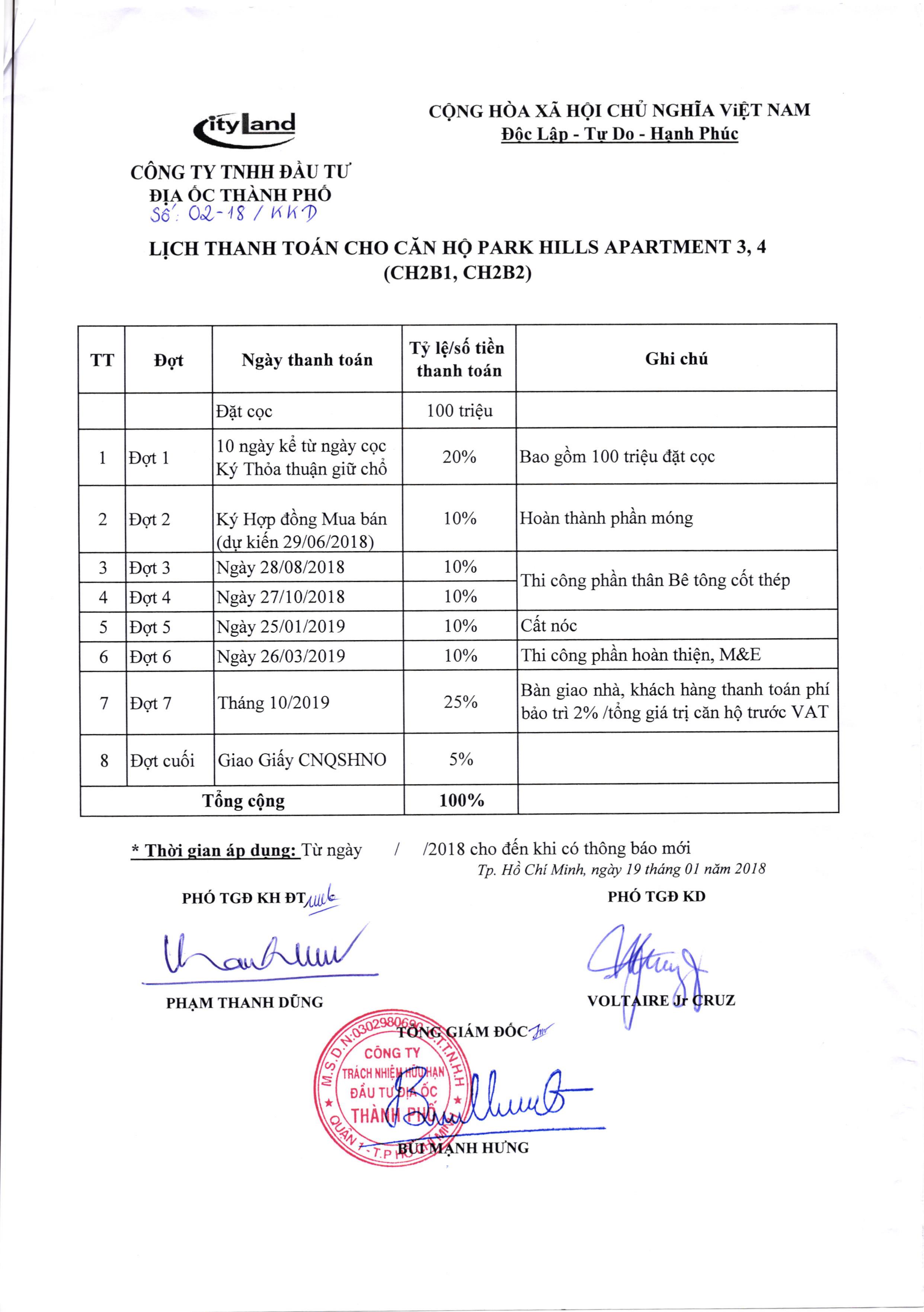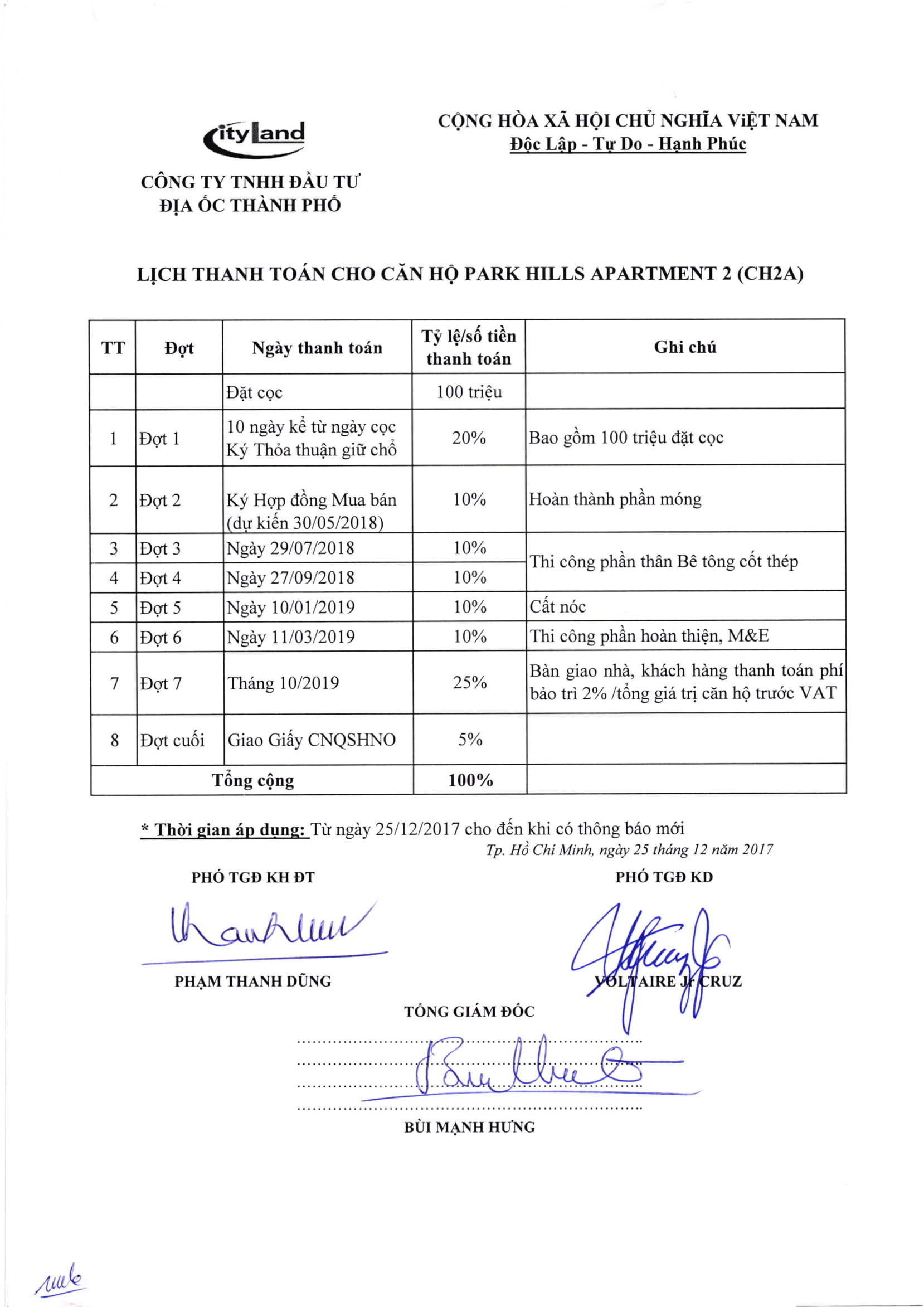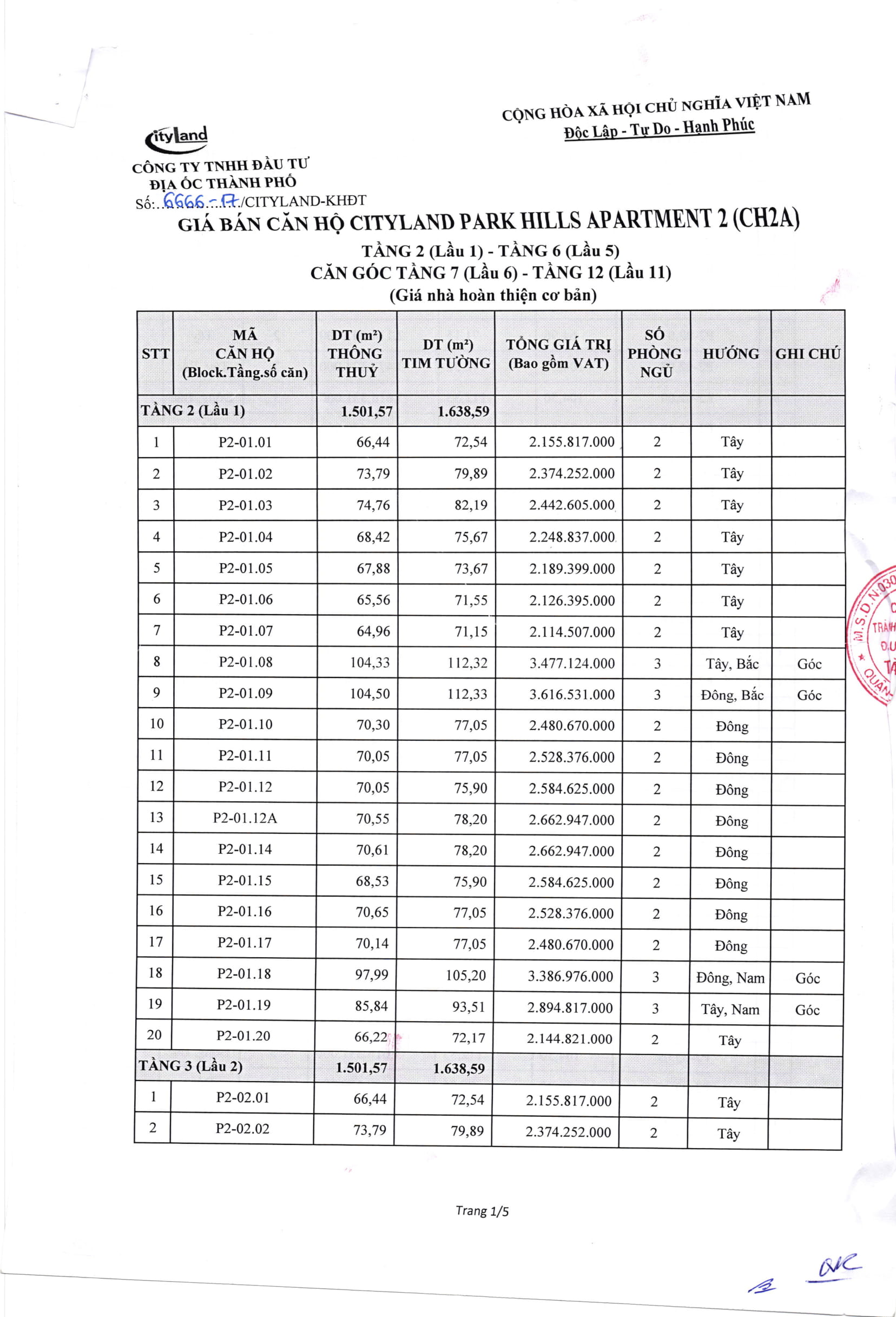 Ngày 27/12/2017 Cityland công bố mở bán block CH2a với bảng giá và tiến độ thanh toán như sau: