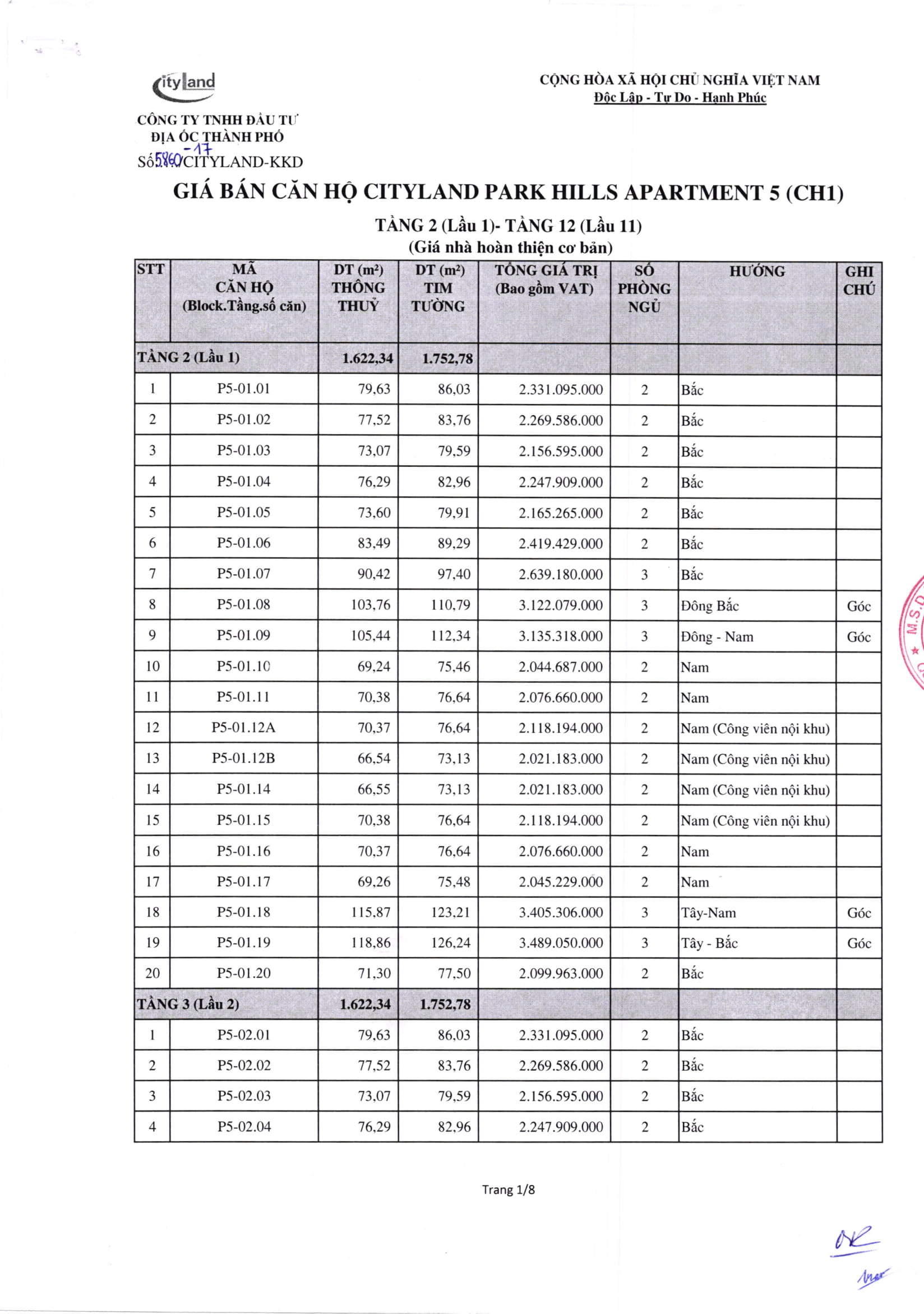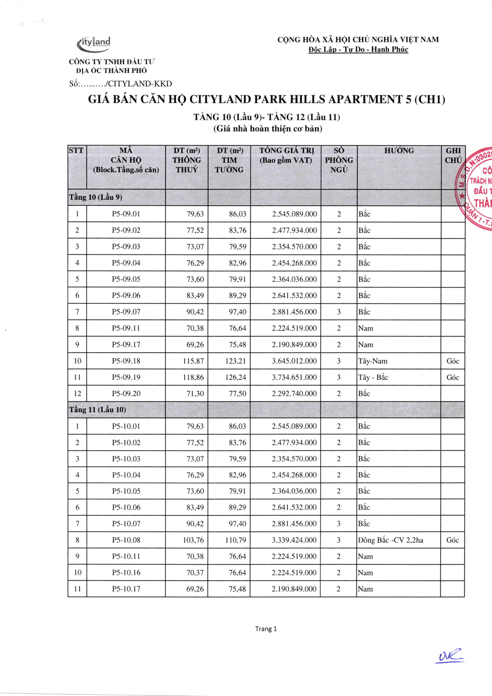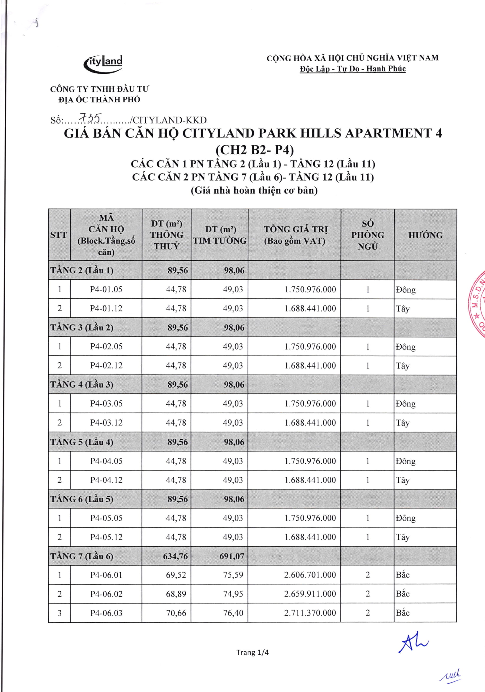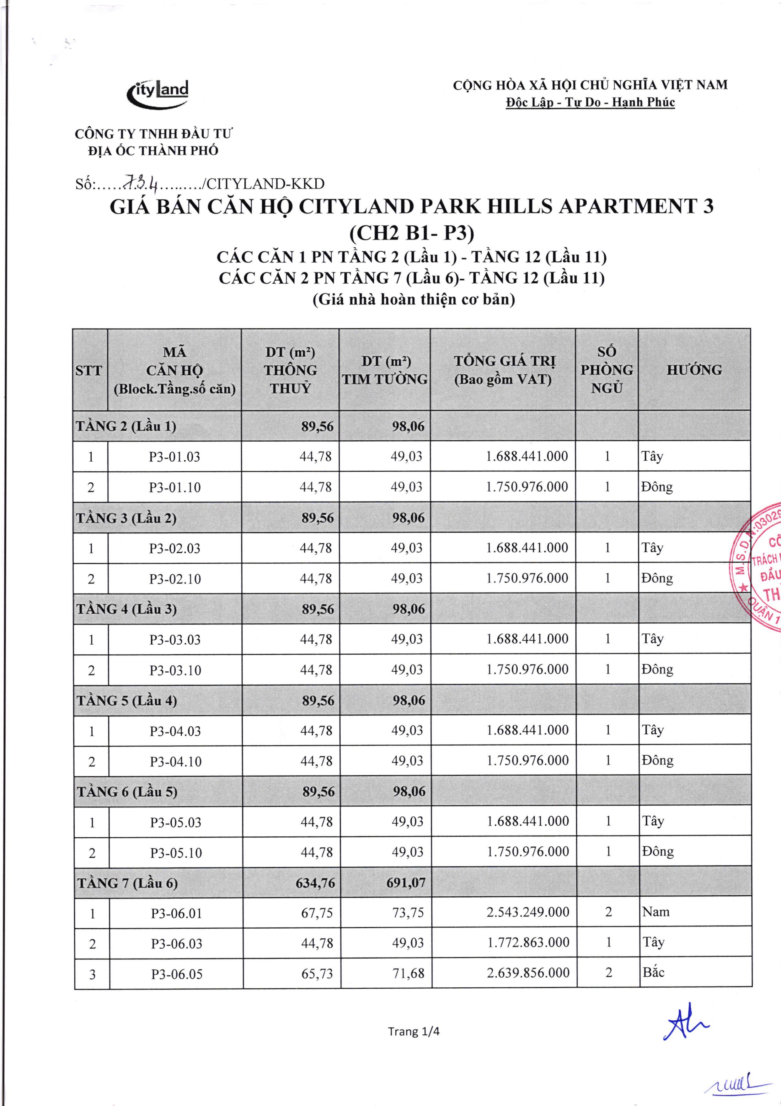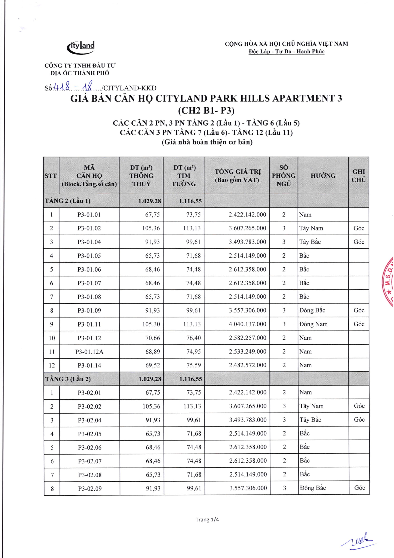 BẢNG GIÁ + TIẾN ĐỘ THANH TOÁN CĂN HỘ CITYLAND PARK HILLS BLOCK P3 VÀ P4 NHỮNG CĂN CÒN LẠI