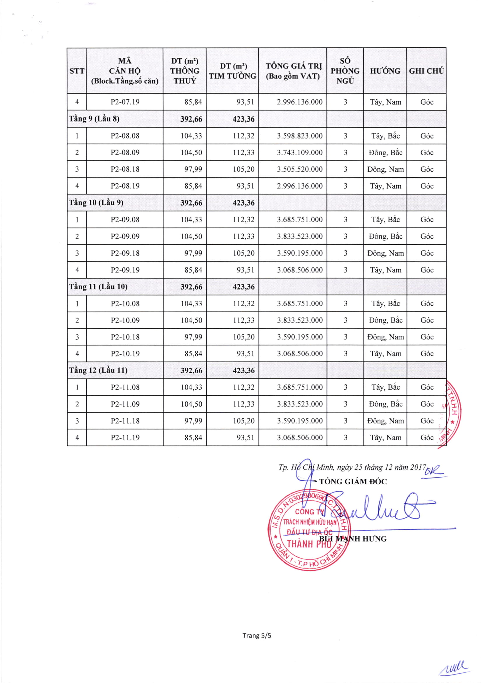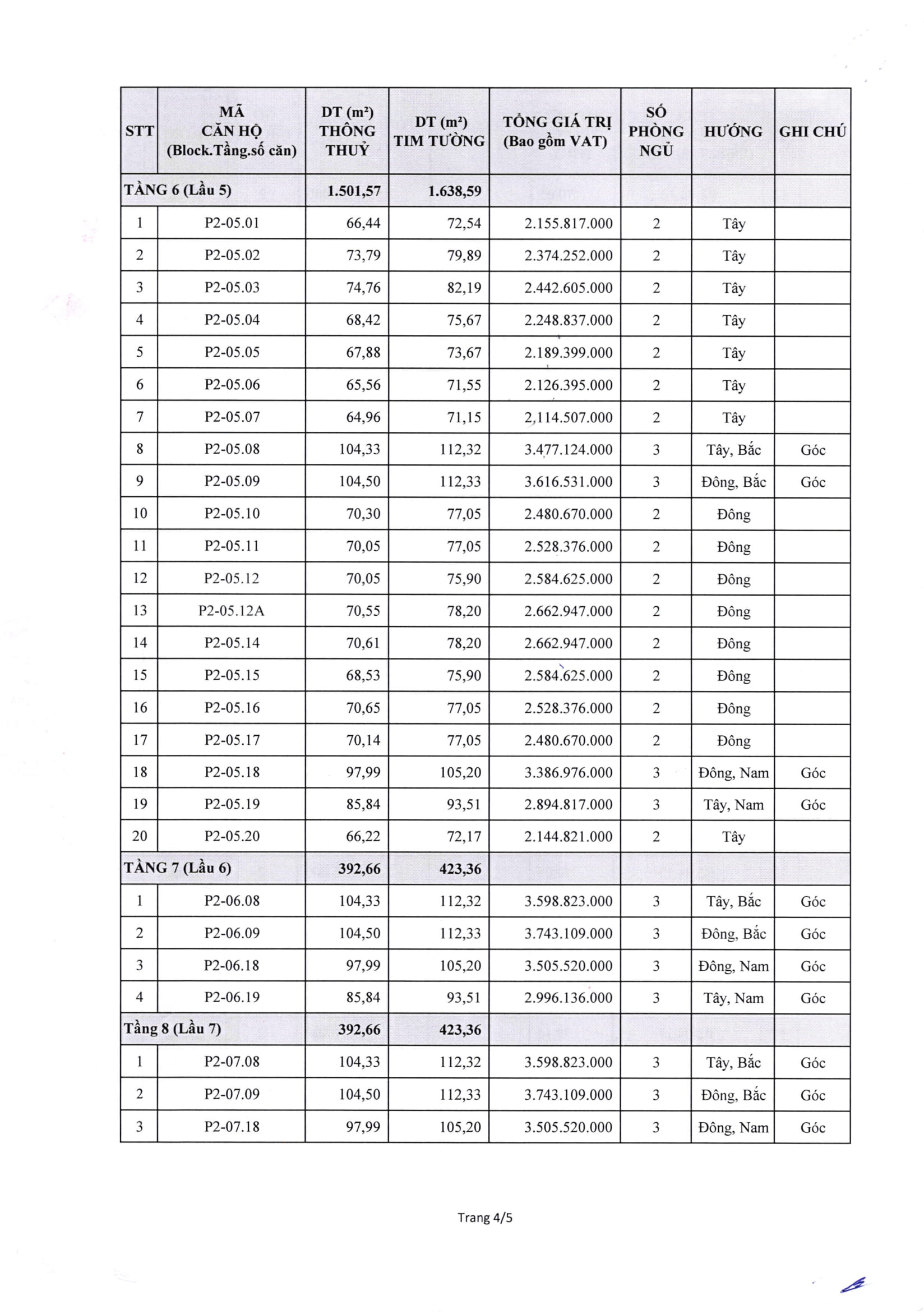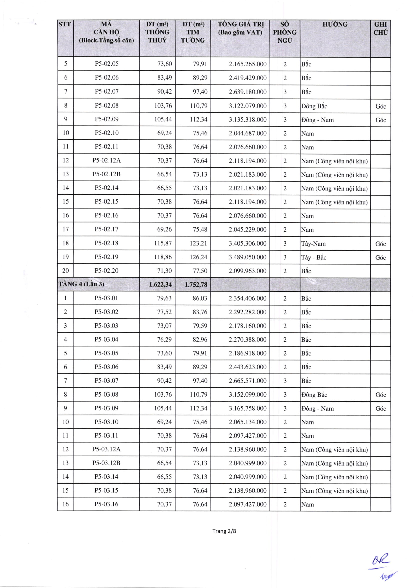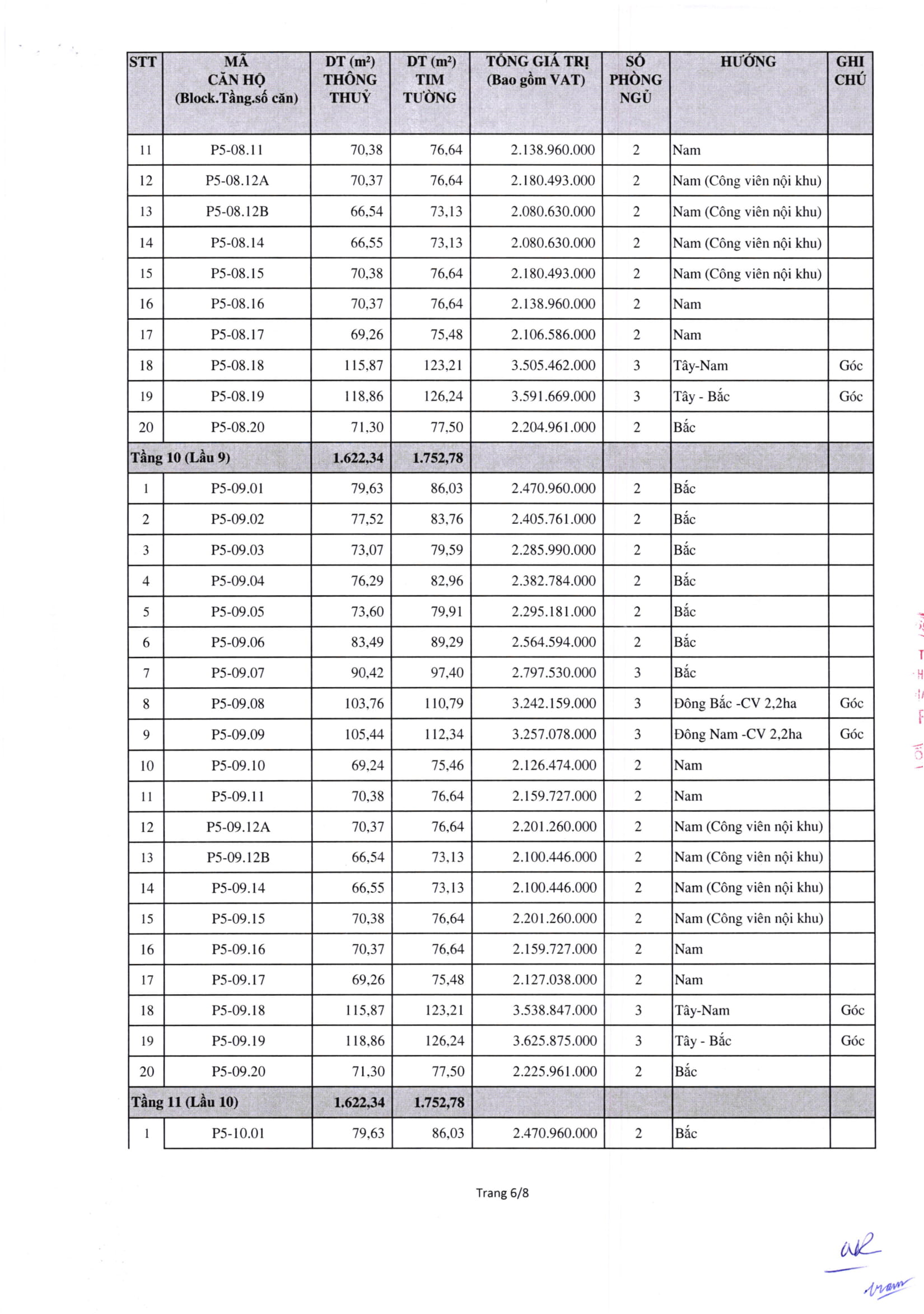 Ngày 04/10/2017 công bố Block P5 với giá và tiến độ thanh toán như sau: