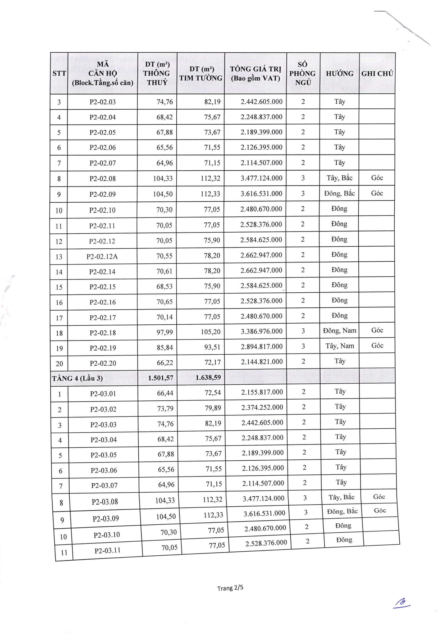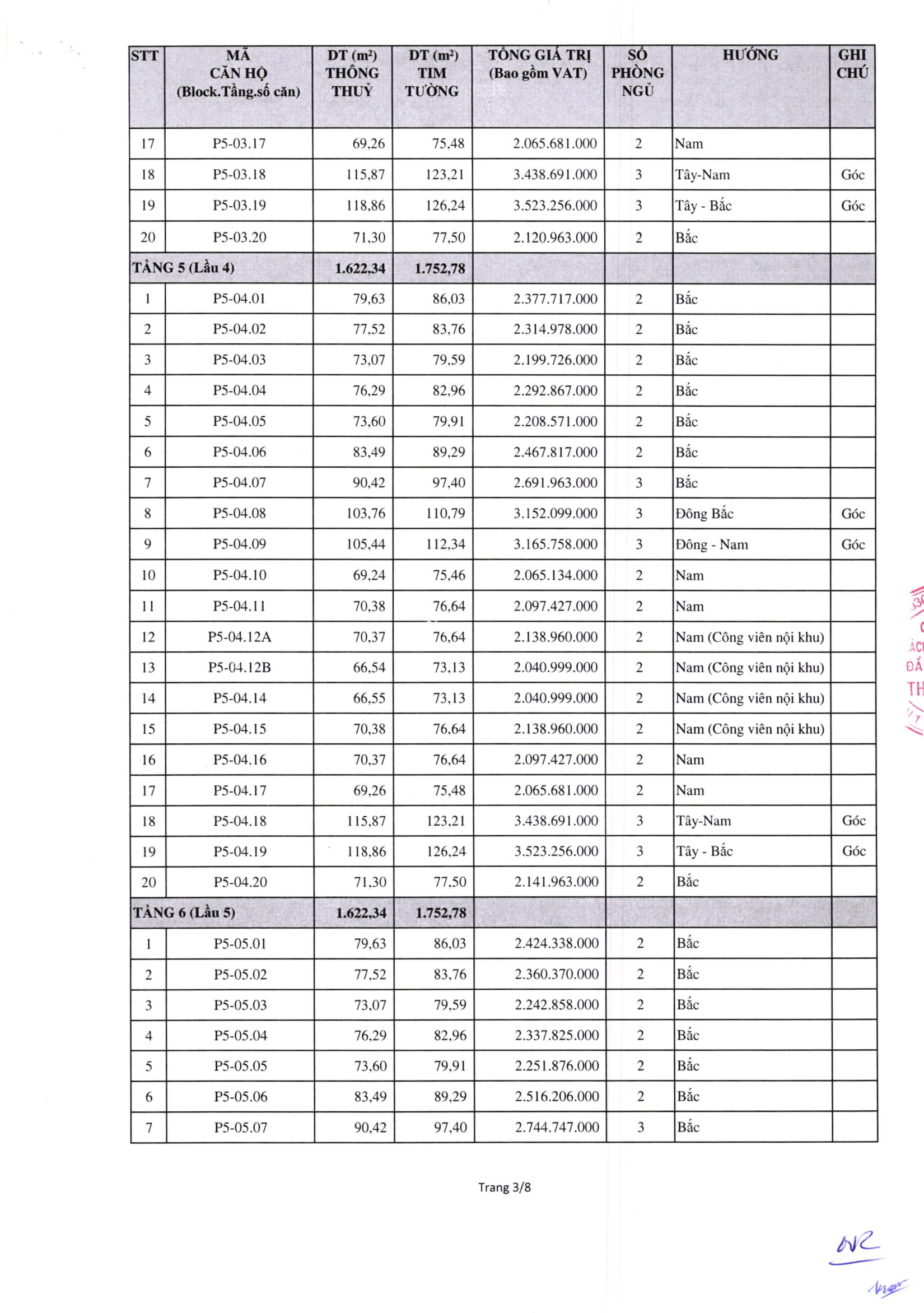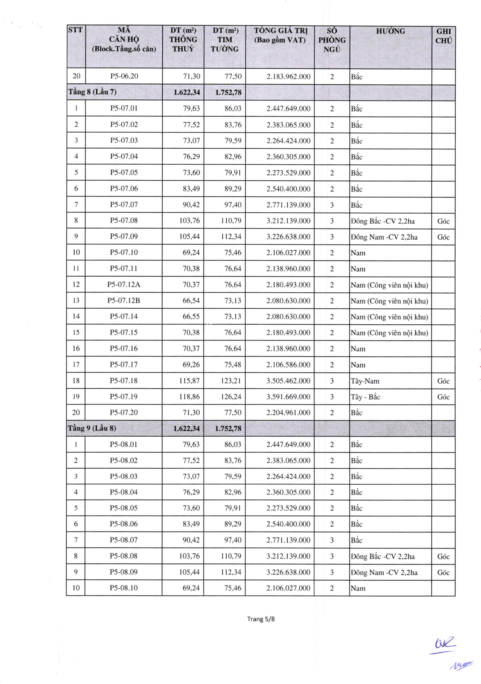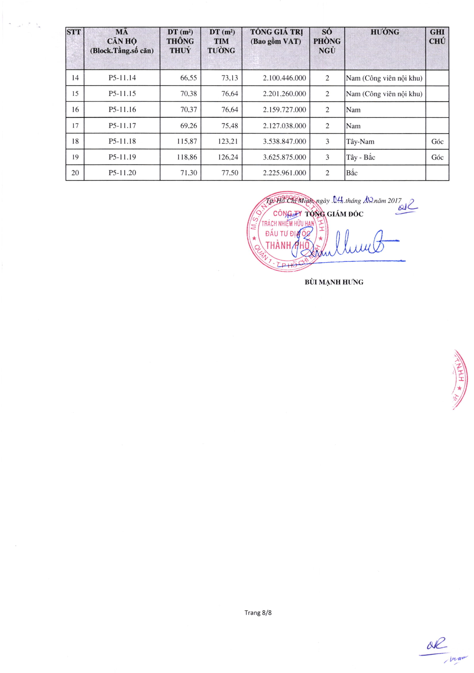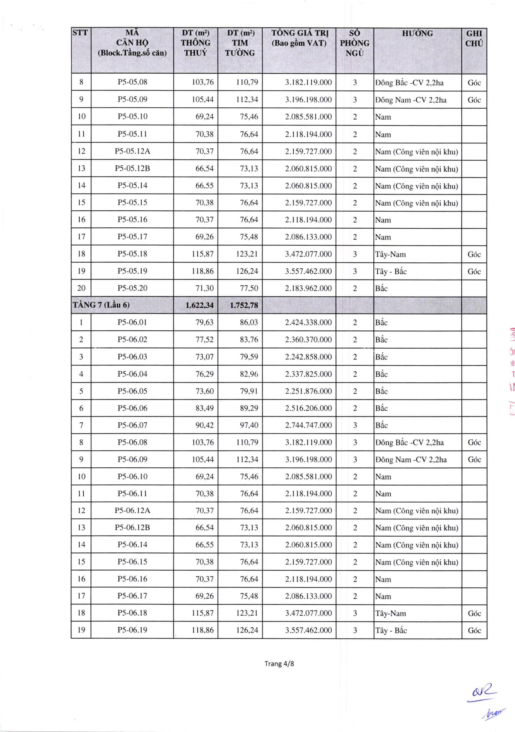 Ngày 04/10/2017 công bố Block P5 với giá và tiến độ thanh toán như sau:
